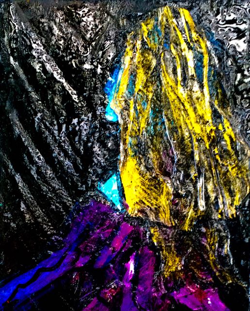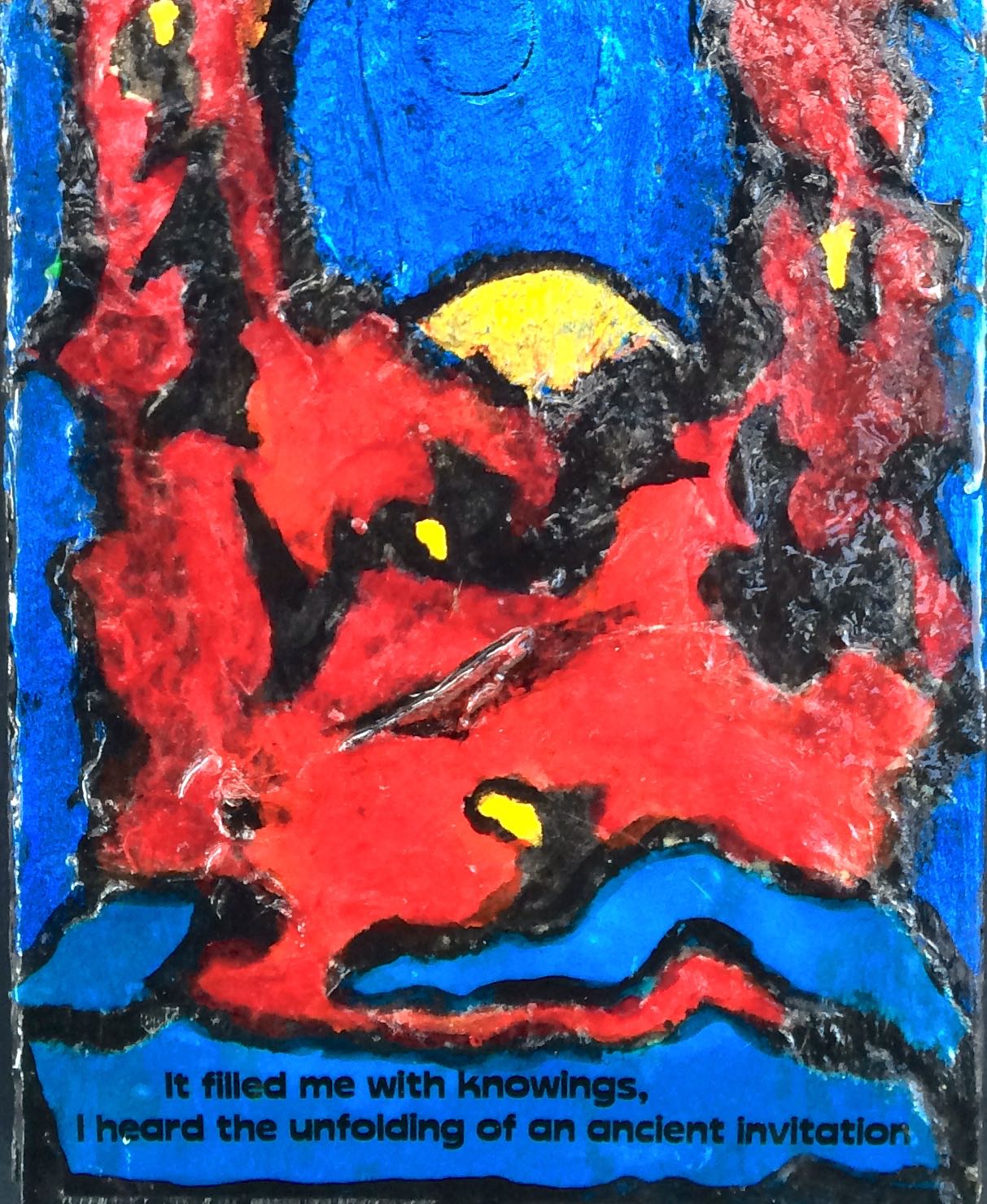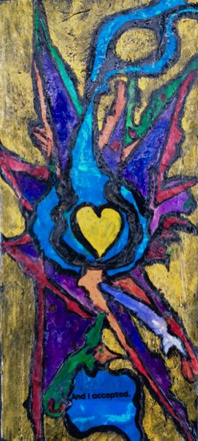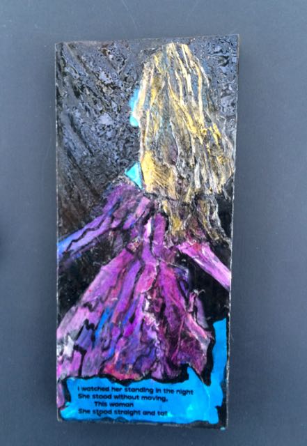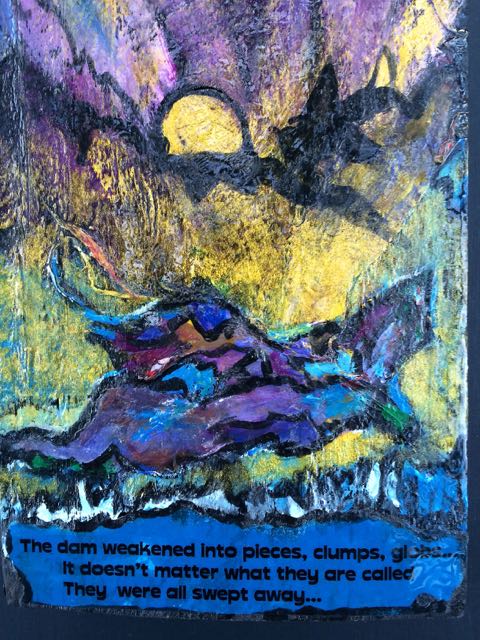 This book was created on fence slats from my yard. I used acrylic paint, hand made kozo paper and assorted textures.